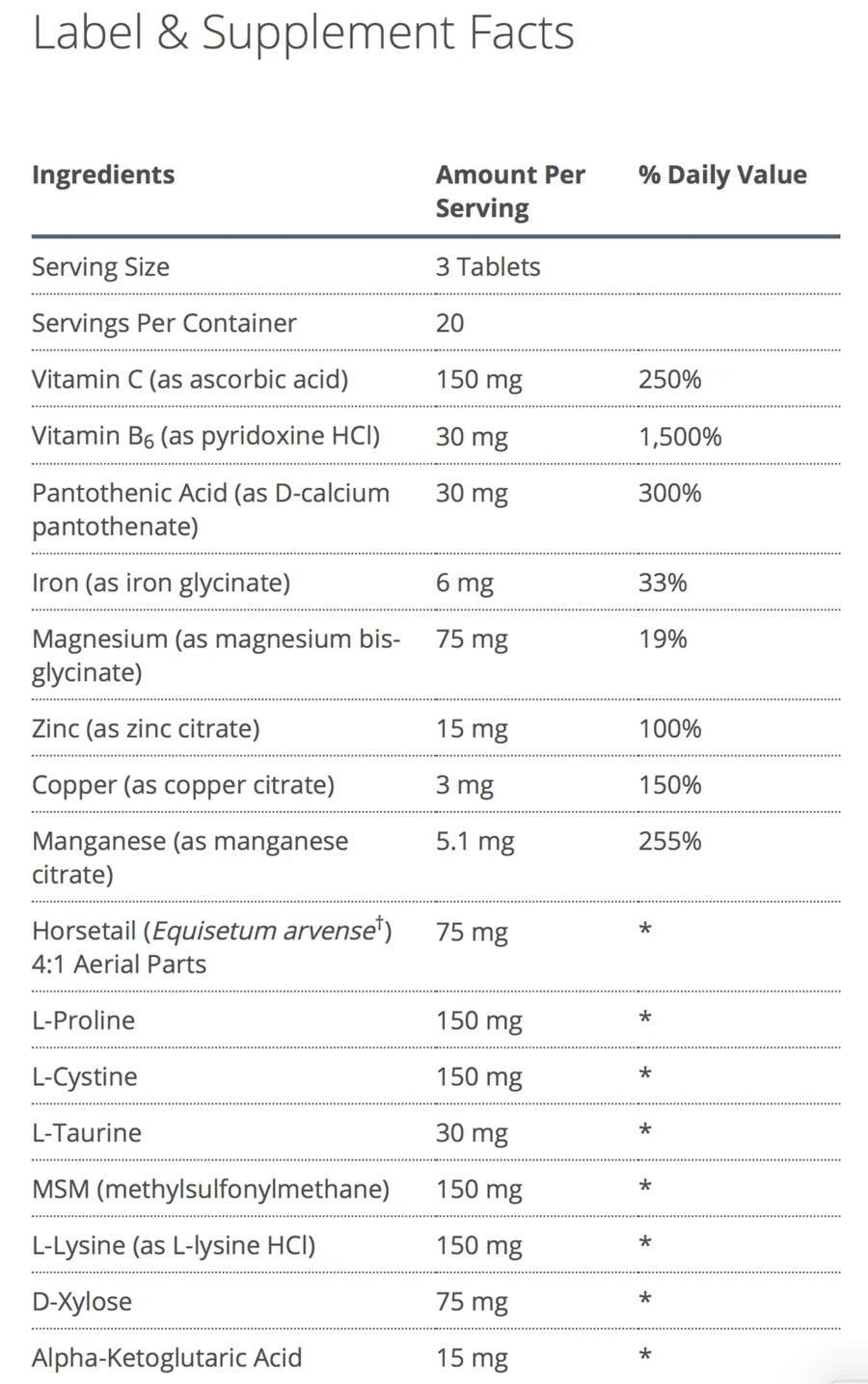 Collagenics® is a unique combination of free-form amino acids, key minerals including magnesium bis-glycinate, horsetail herb (containing silica), and other nutrients known to be involved in the biochemical processes that support healthy connective tissue and collagen.